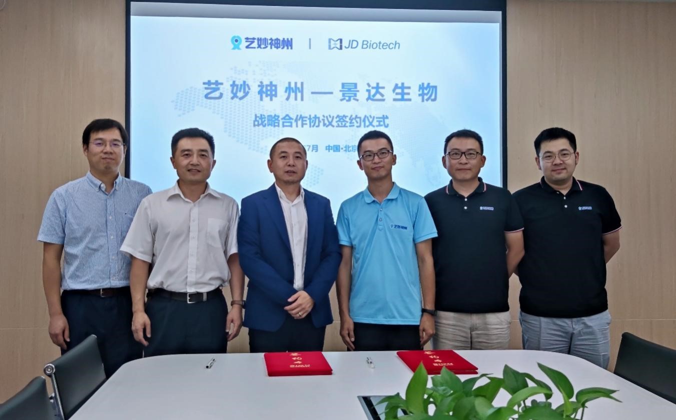 藝妙神州CEO何霆和景達生物董事長王立燕代表雙方簽約。藝妙神州副總裁亓曉溫、總裁助理侯旺晨,景達生物CEO郭雷鳴、CSO楊月峰等共同出席了簽約儀式。