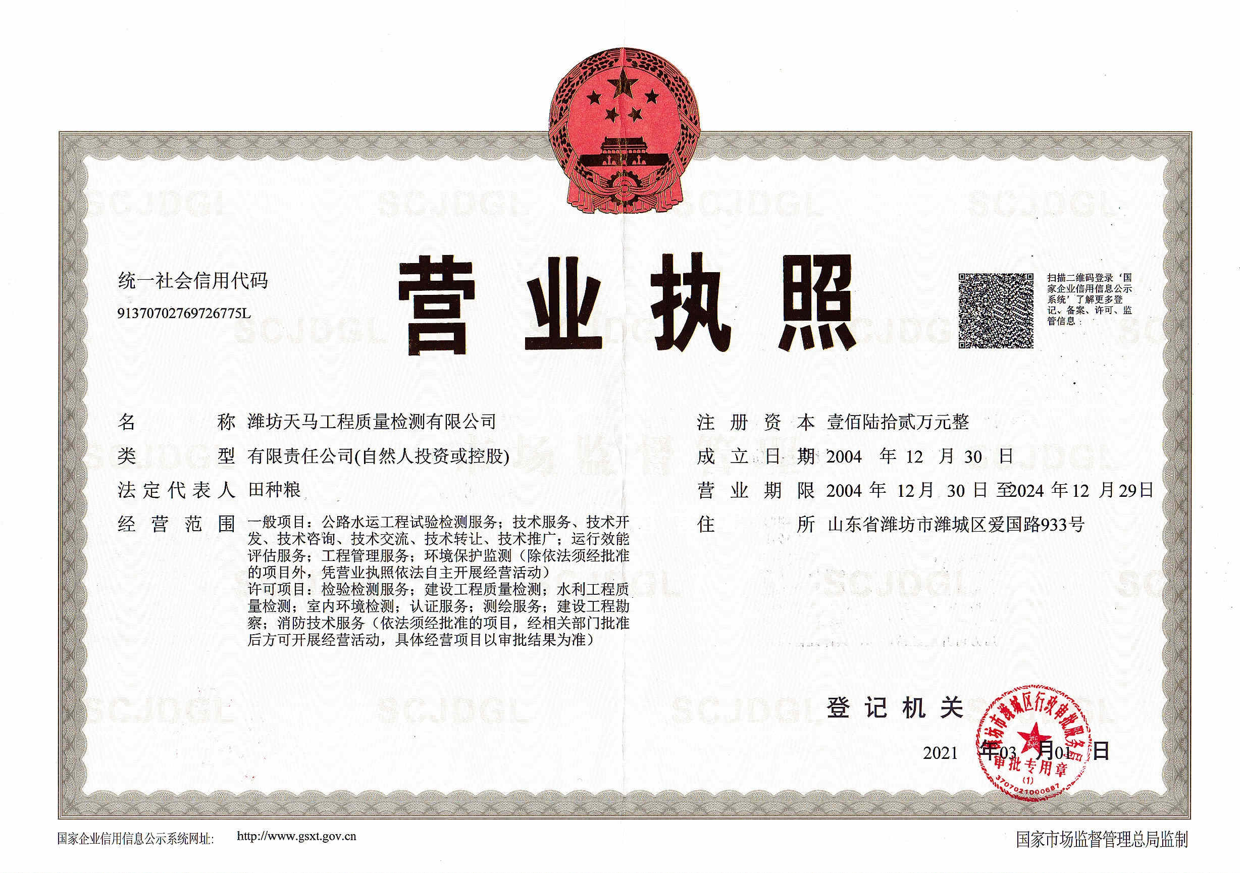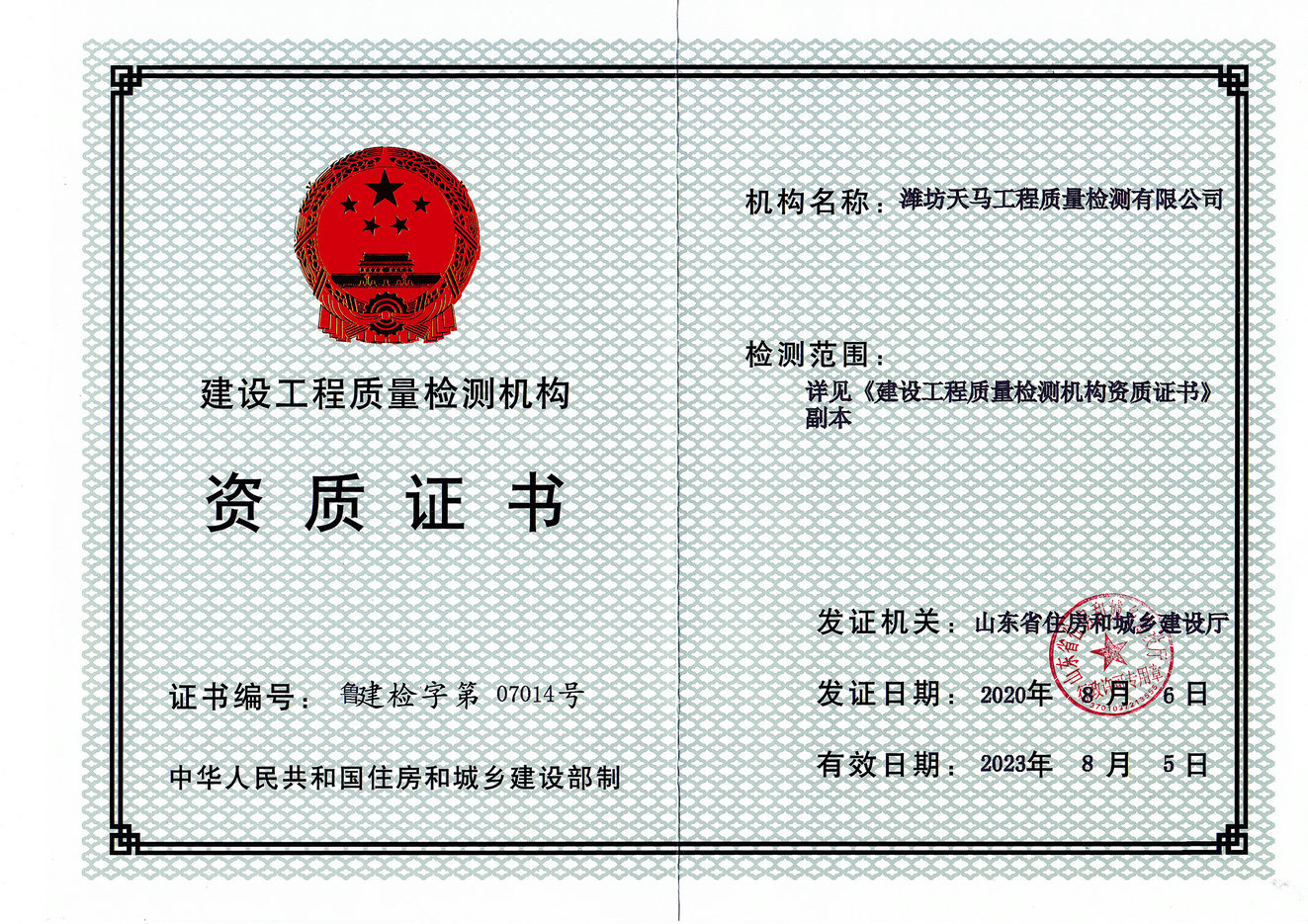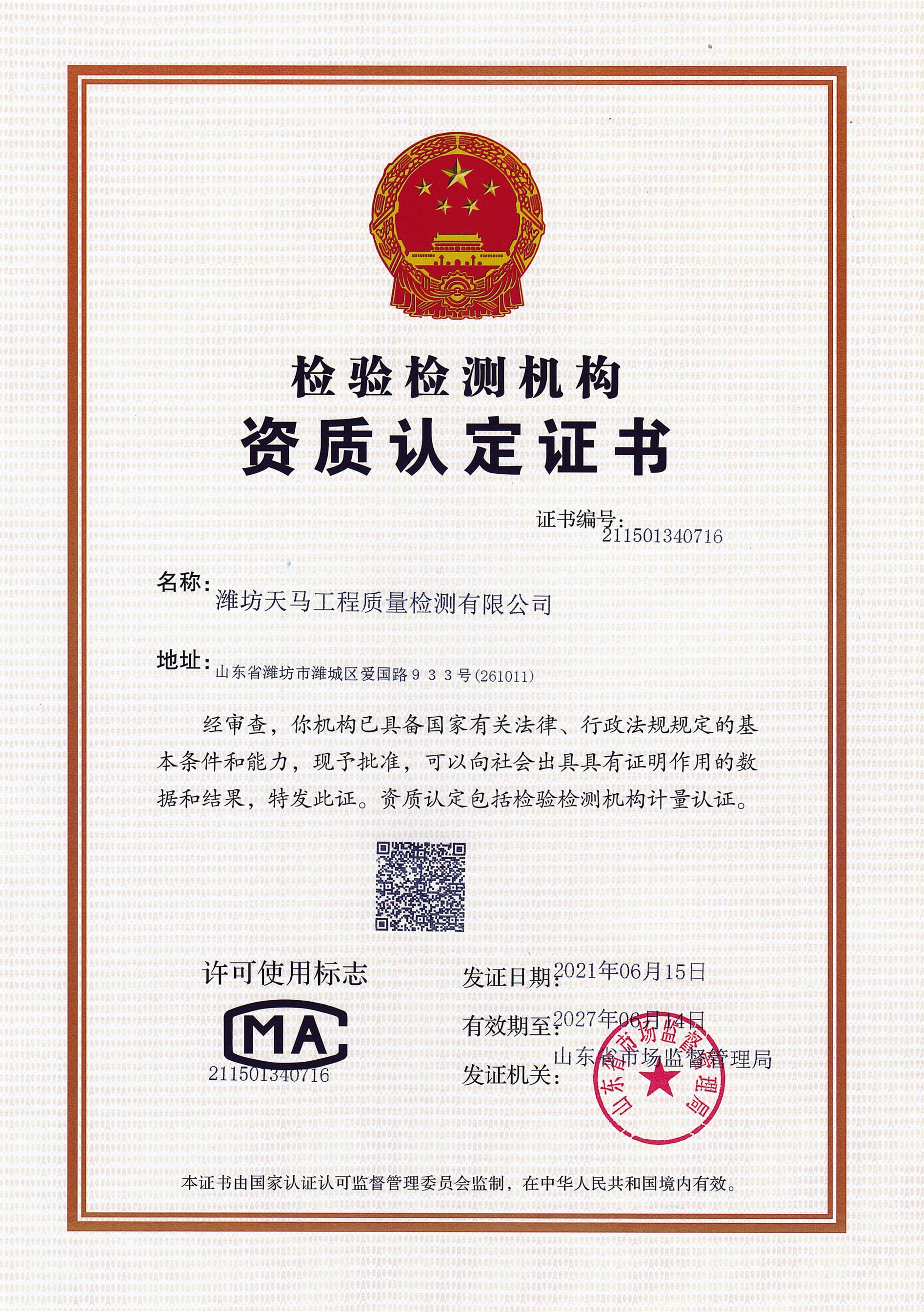 濰坊天馬工程質量檢測有限公司 版權所有! 地址:山東省濰坊市濰城區愛國路933號(建設街與愛國路交叉口西北角)